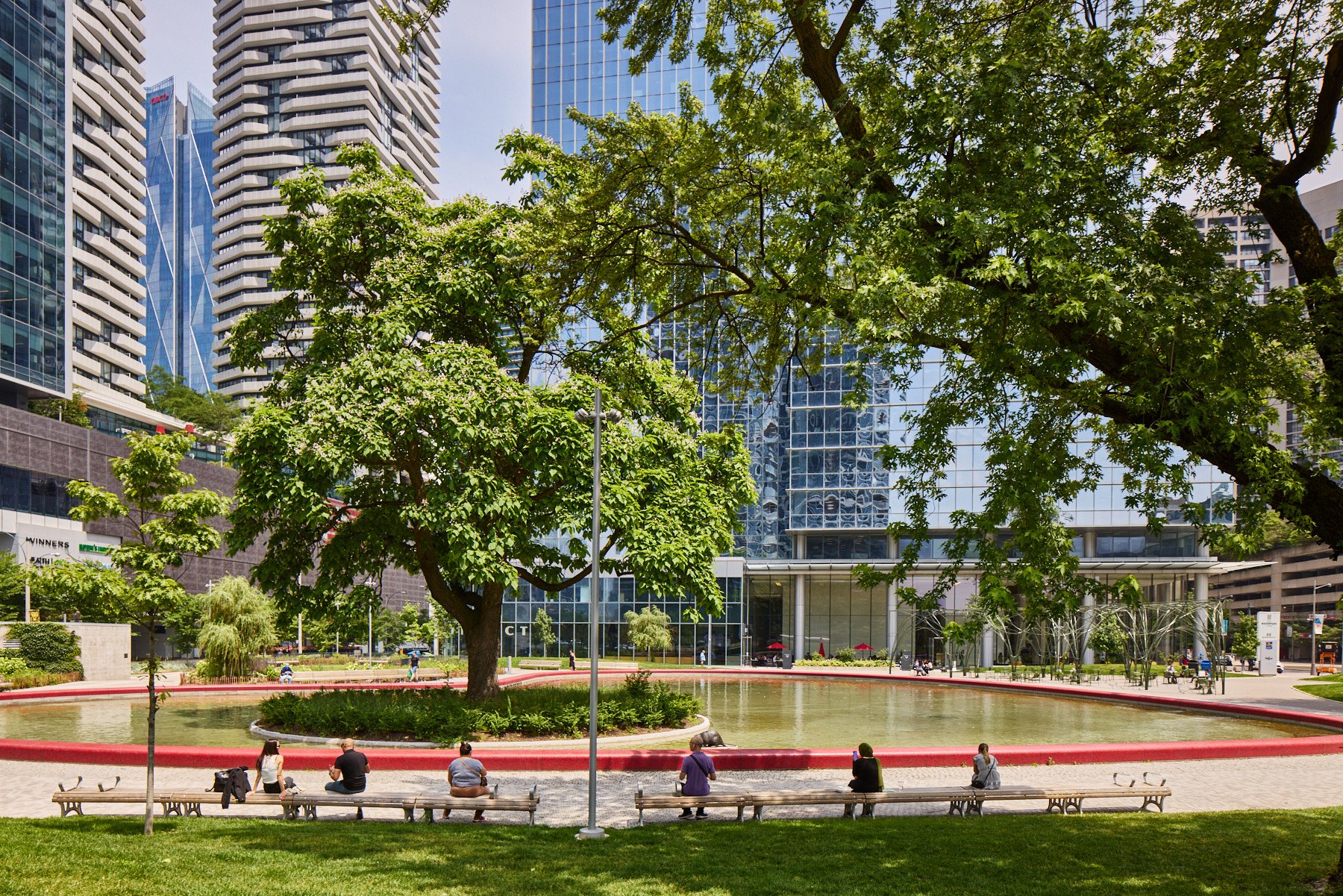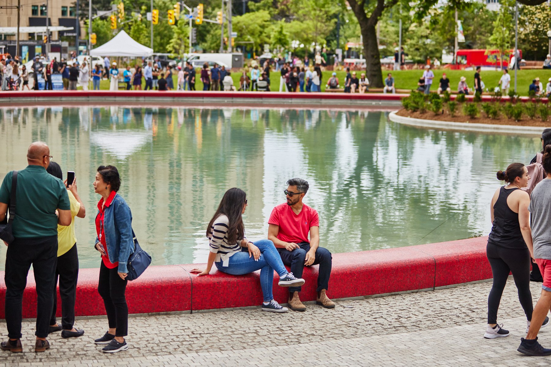 Love Park in Toronto was designed by landscape architecture firm Claude Cormier + Associés (CCxA) in collaboration with gh3 architects. The team created a 2-acre, heart-themed urban oasis featuring a red mosaic water feature.
