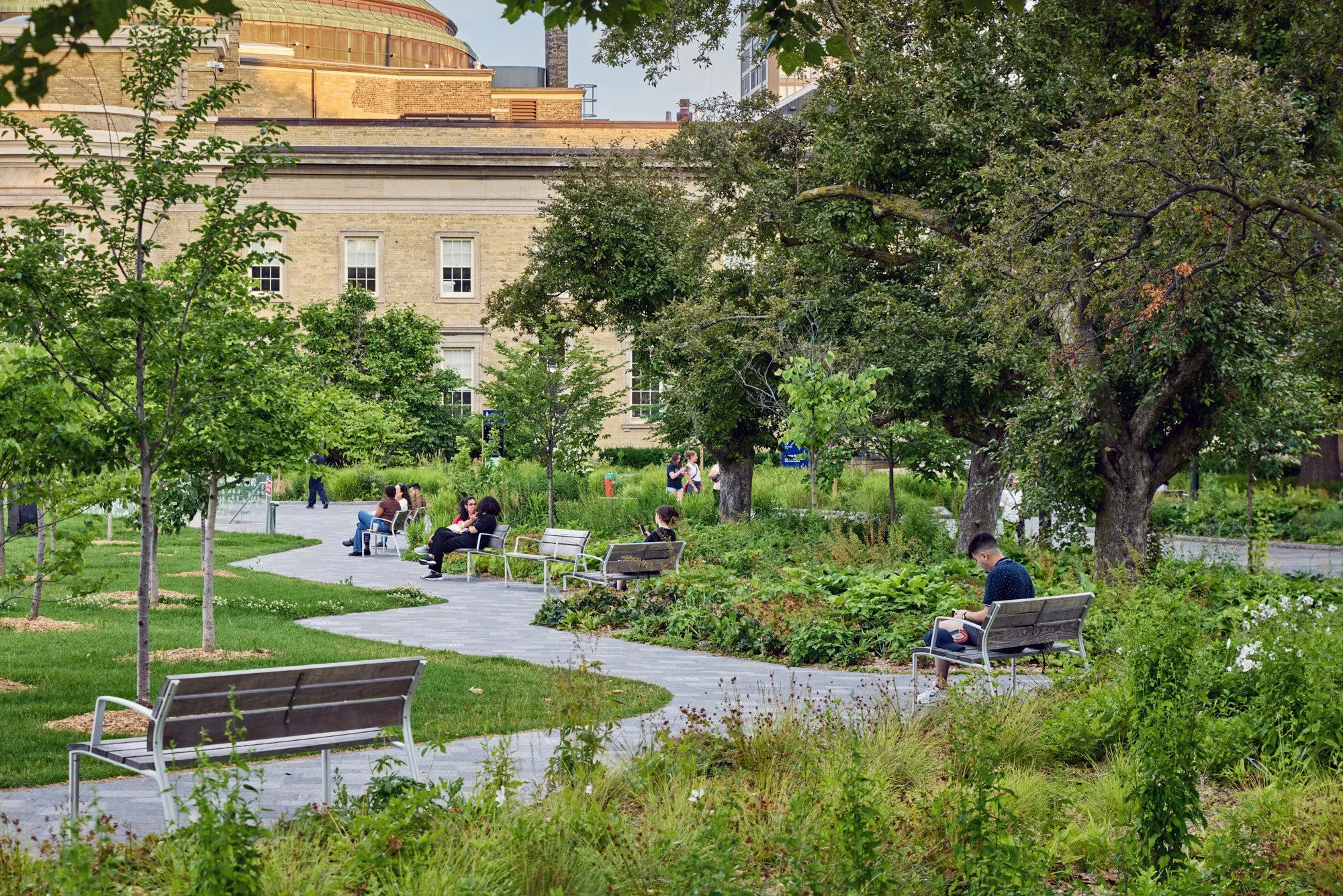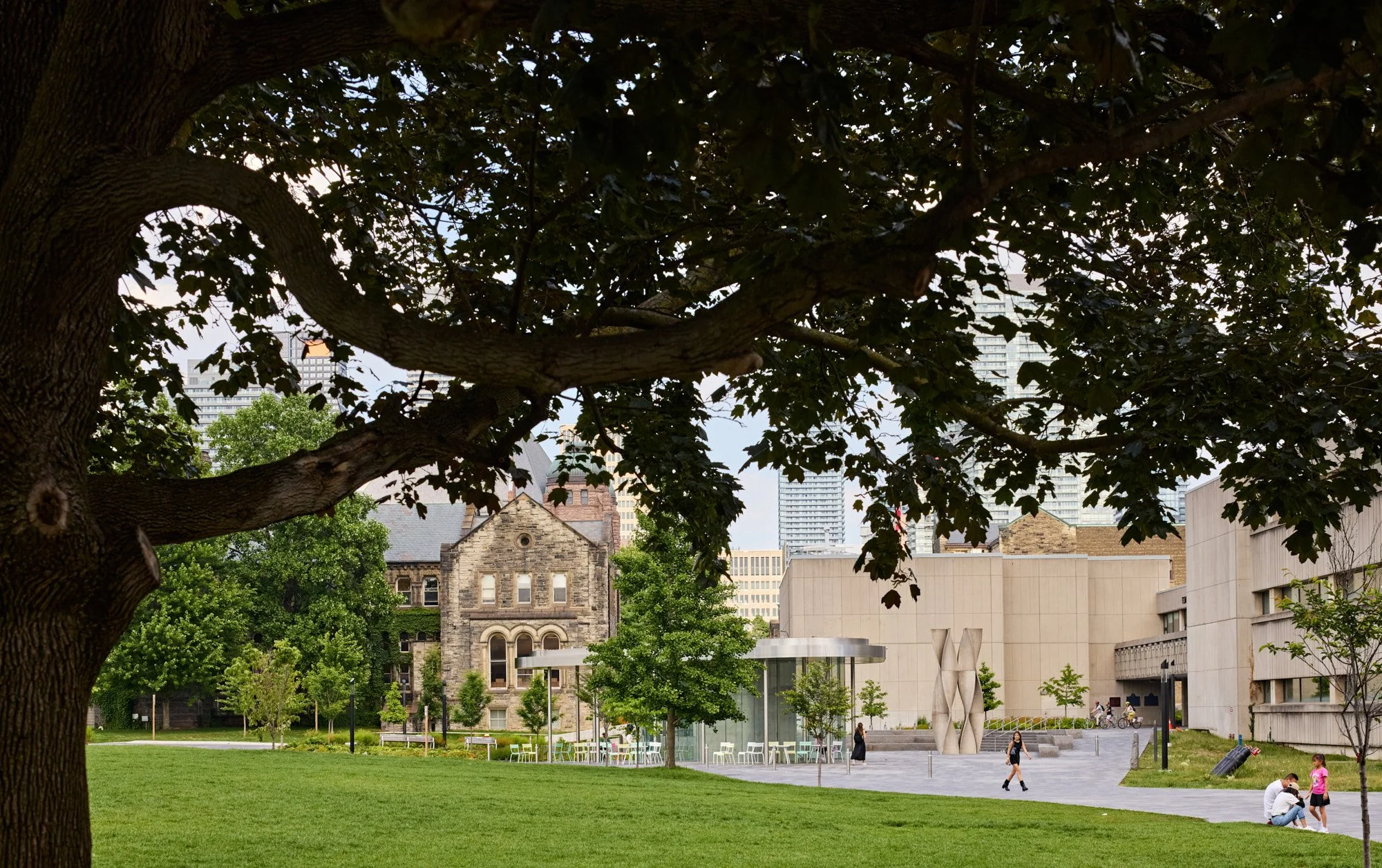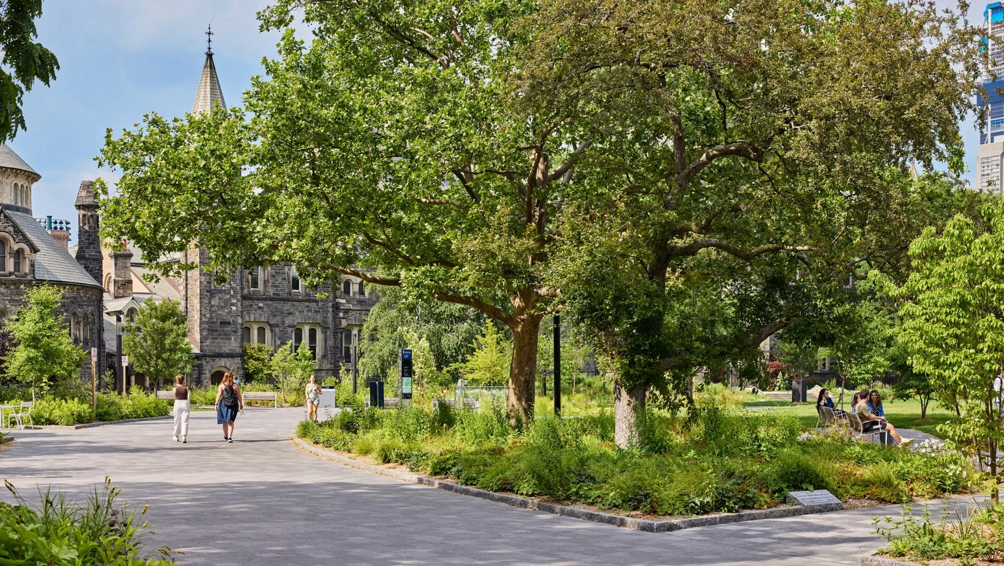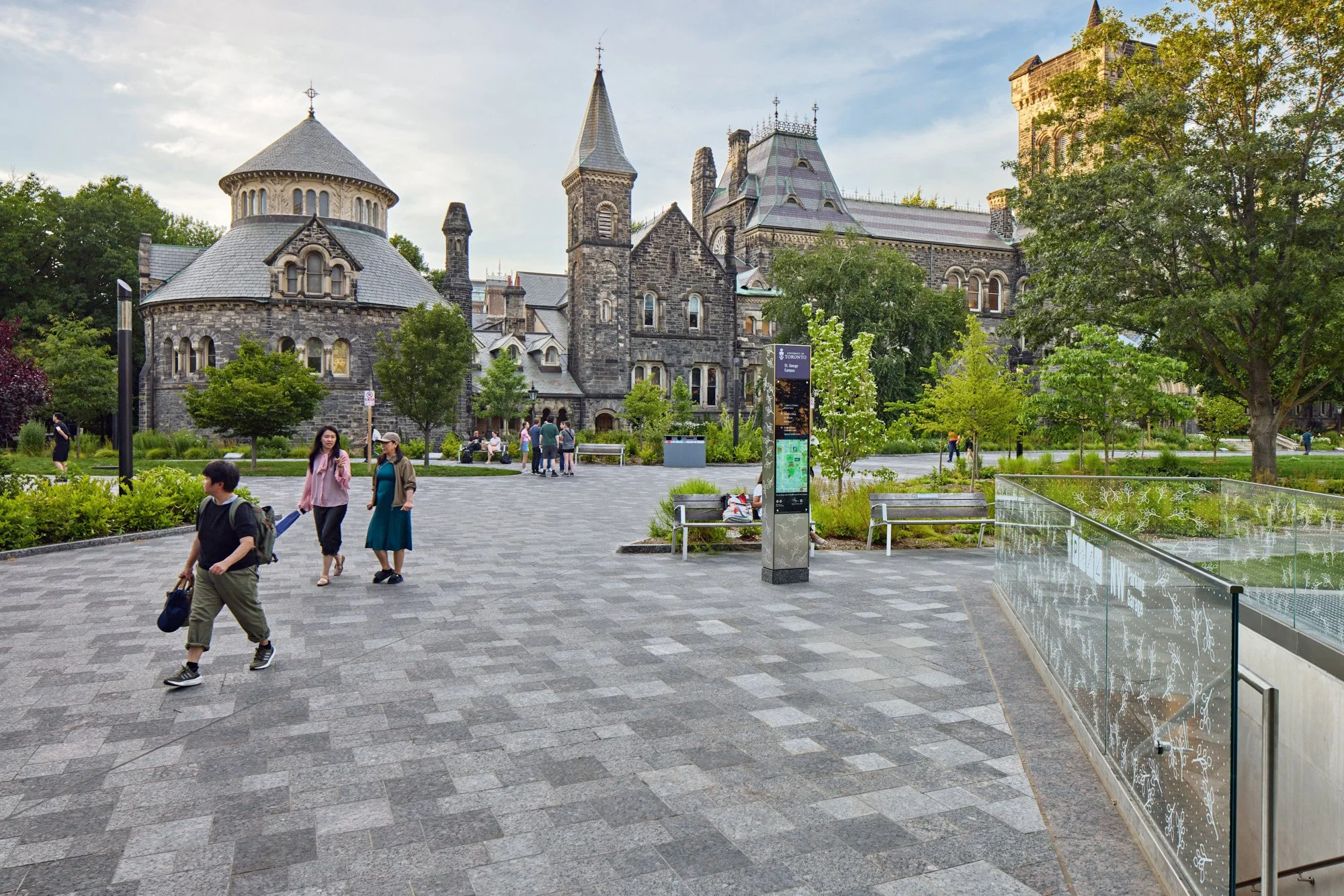 The University of Toronto is situated within a richly layered urban environment, where historic quadrangles, collegiate architecture, and mature tree canopies contribute to its internationally recognized character. The landscape design respects these traditions, reinforcing axial views, stone-paved walks, and framed courtyards, while integrating new interventions that remain distinctly of their time.